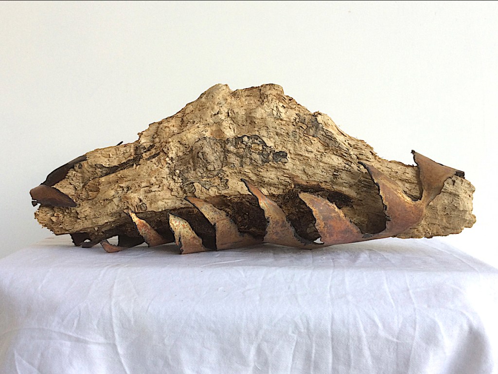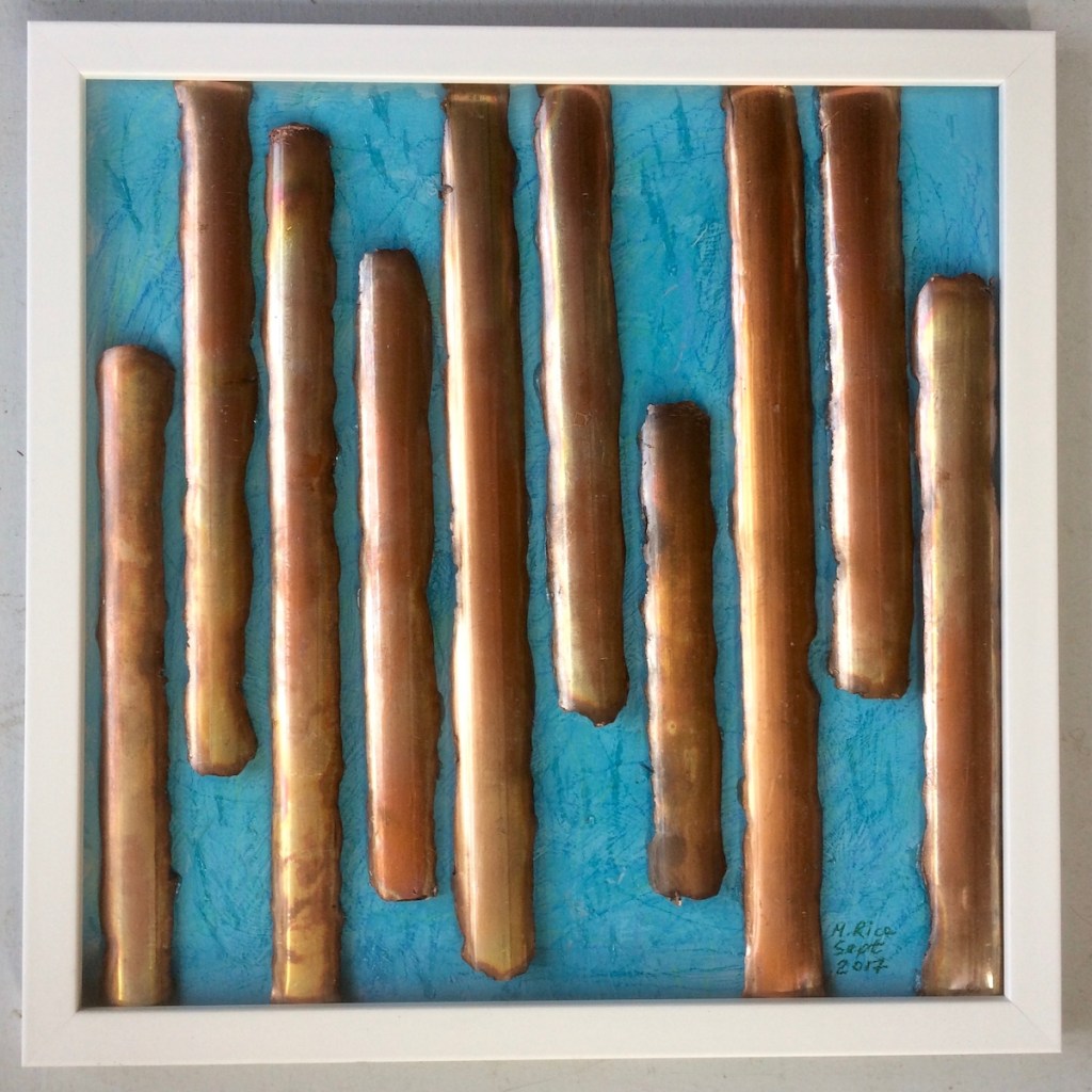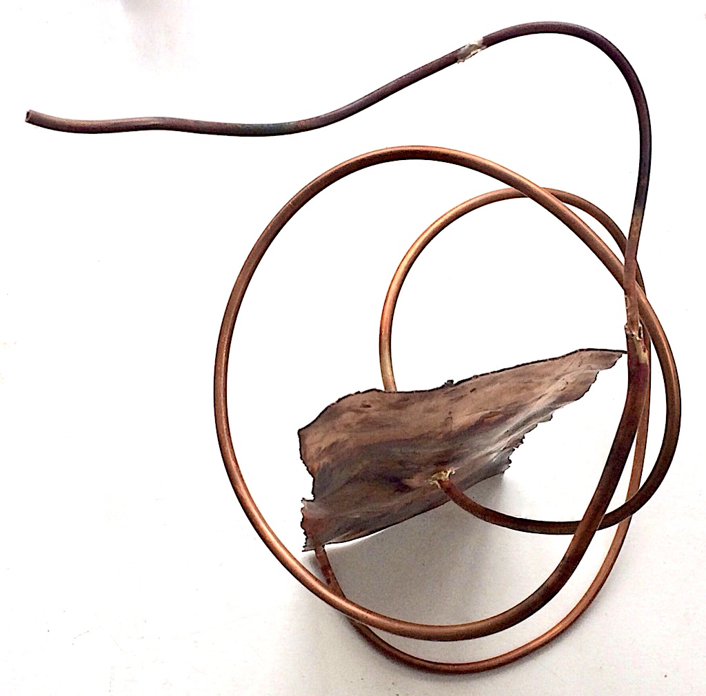 Copper is an amazing material. It was the first metal to be processed and utilised by man. It has wonderful workability using ‘heat and beat’. Heat reinvigorates the material making it ductile – facilitating shaping, stretching, bending and forming until the material becomes rigid and needs to be heated again. The colour and sheen of copper is truly beautiful – the oxides and colours it produces are equally wonderful. Work is often created from the humble plumber’s tube or from larger and smaller tubes, sheet and foil forms are also used.